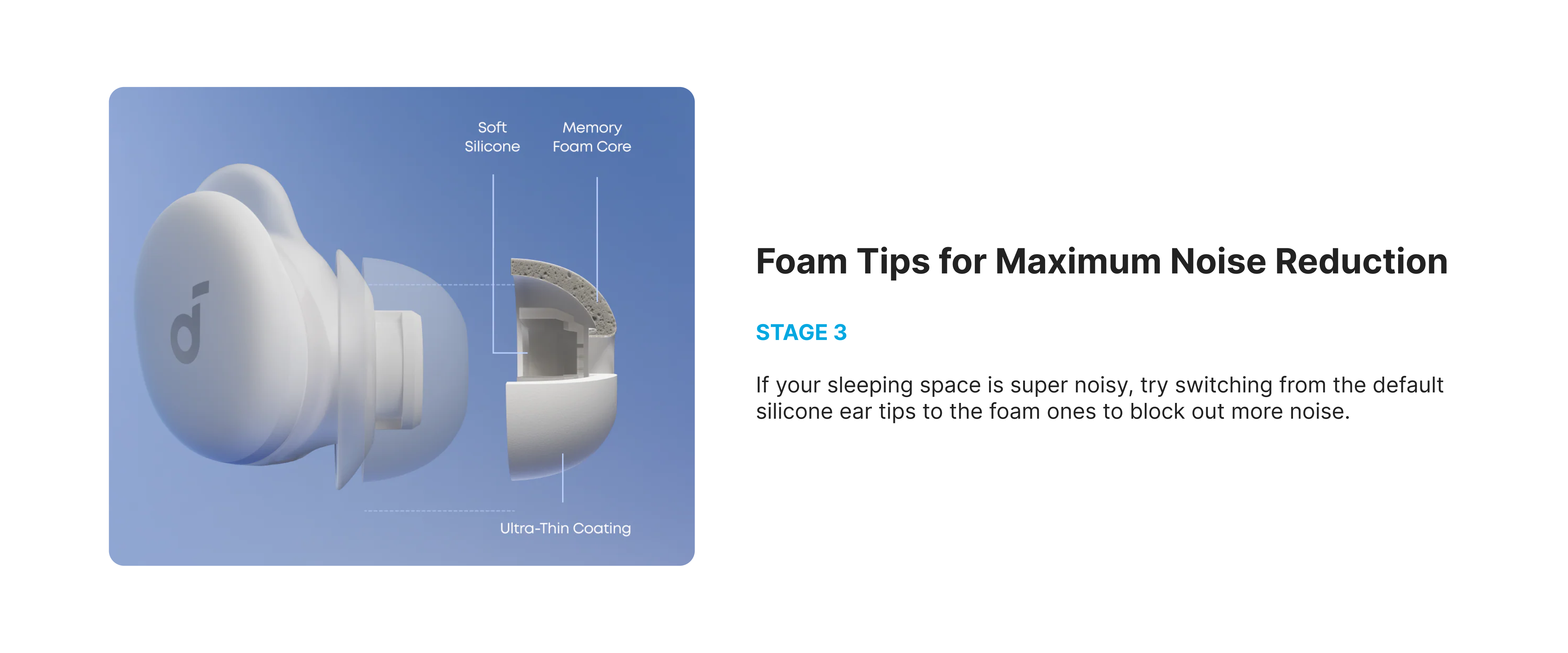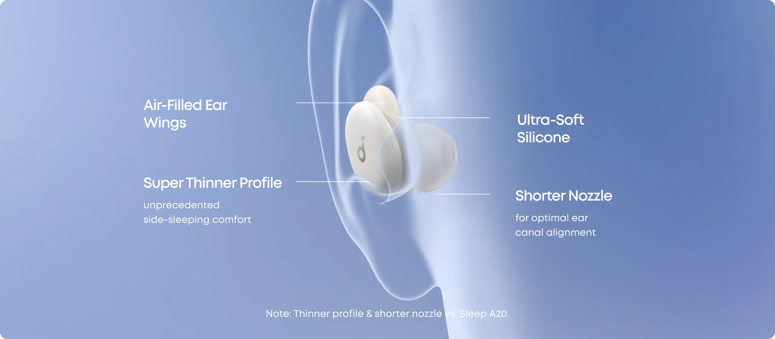 Made for side sleepers, Sleep A30 features ultra-soft silicone tips, a slim profile, and shorter nozzles shaped using 3D mapping of thousands of ear canals. Light, compact, and customizable through the Soundcore app, you can set sleep sounds, reminders, alarms, and more—tailored to your perfect bedtime routine.
