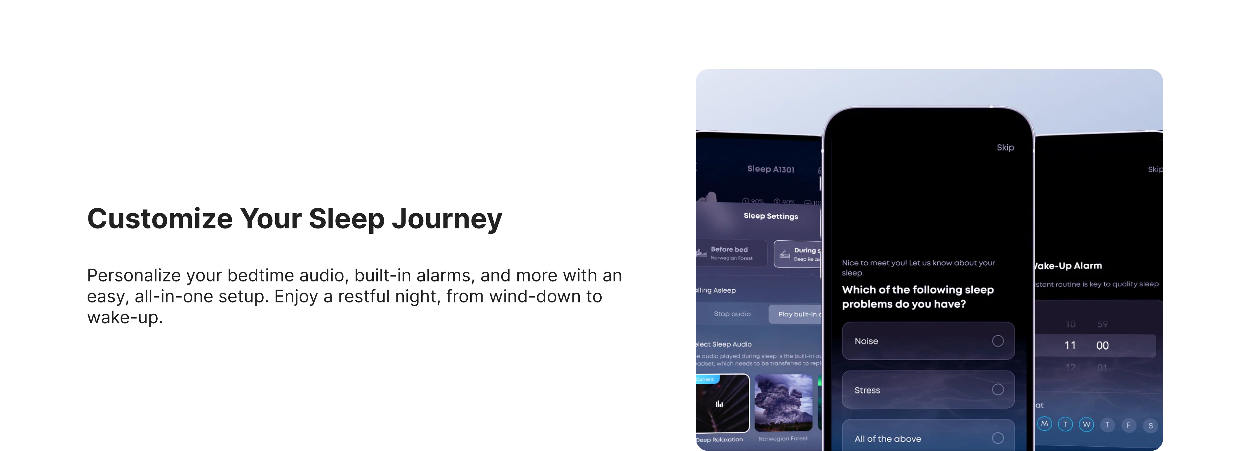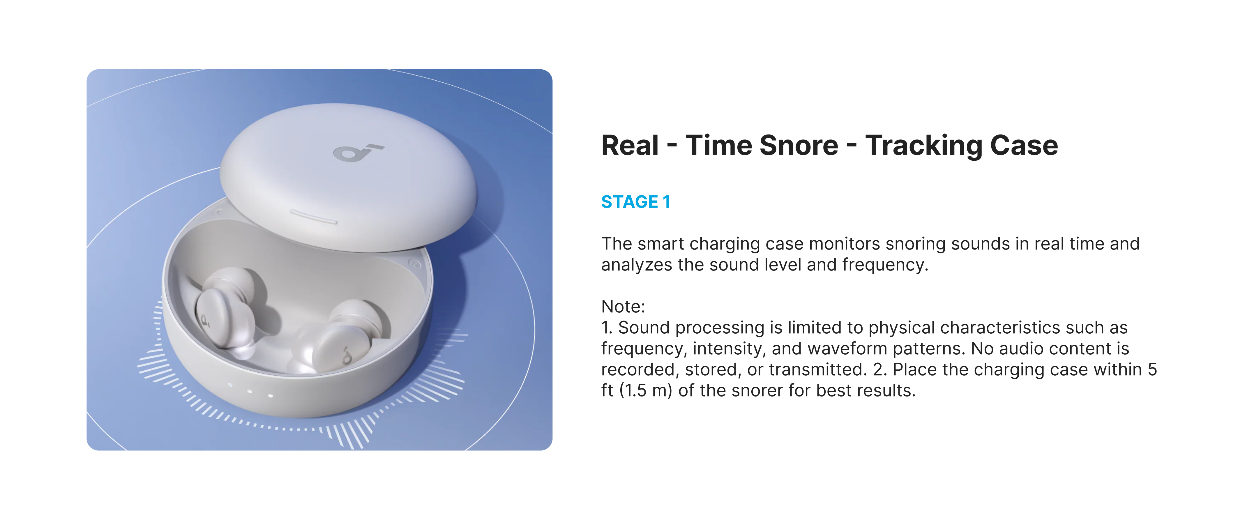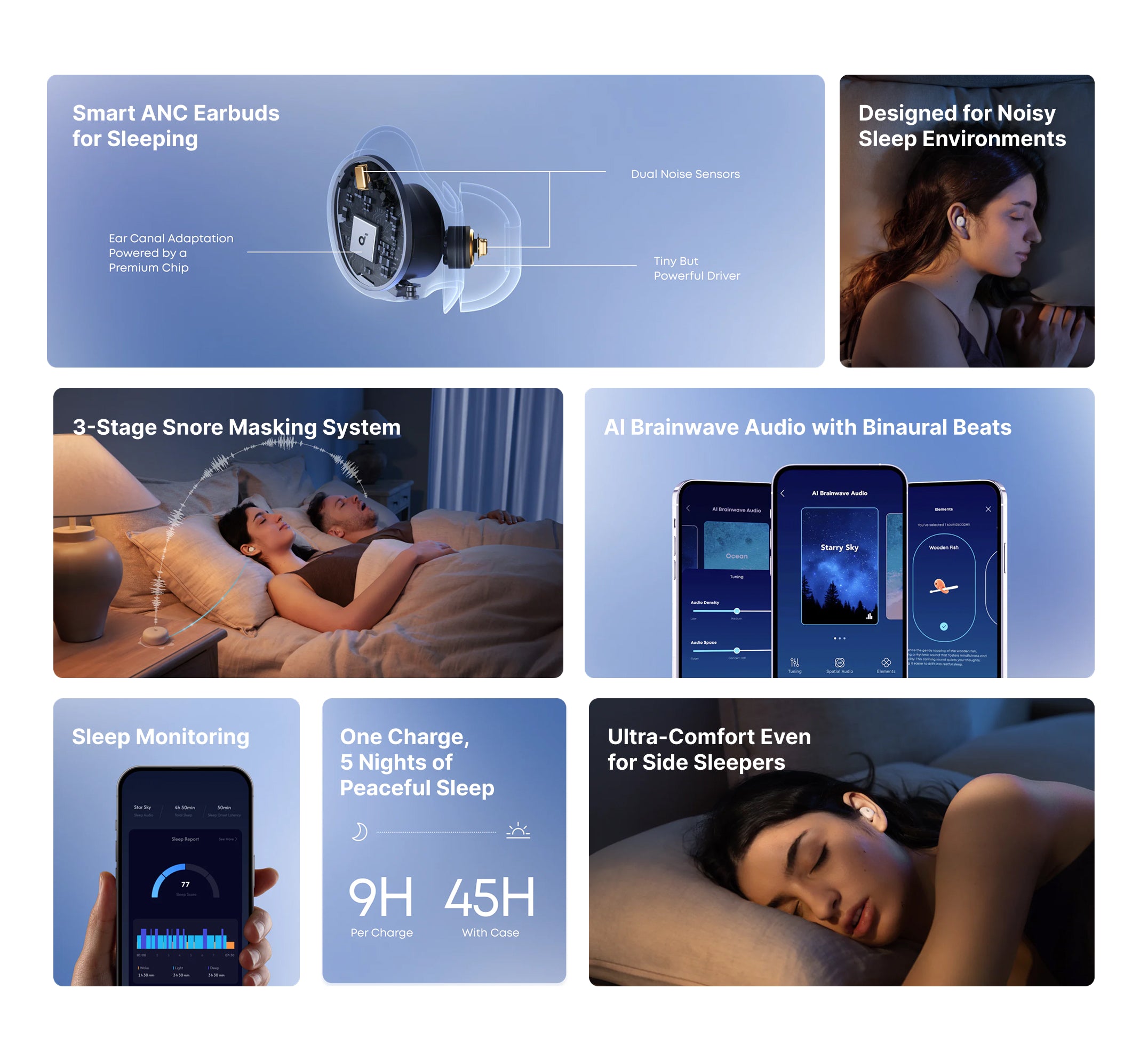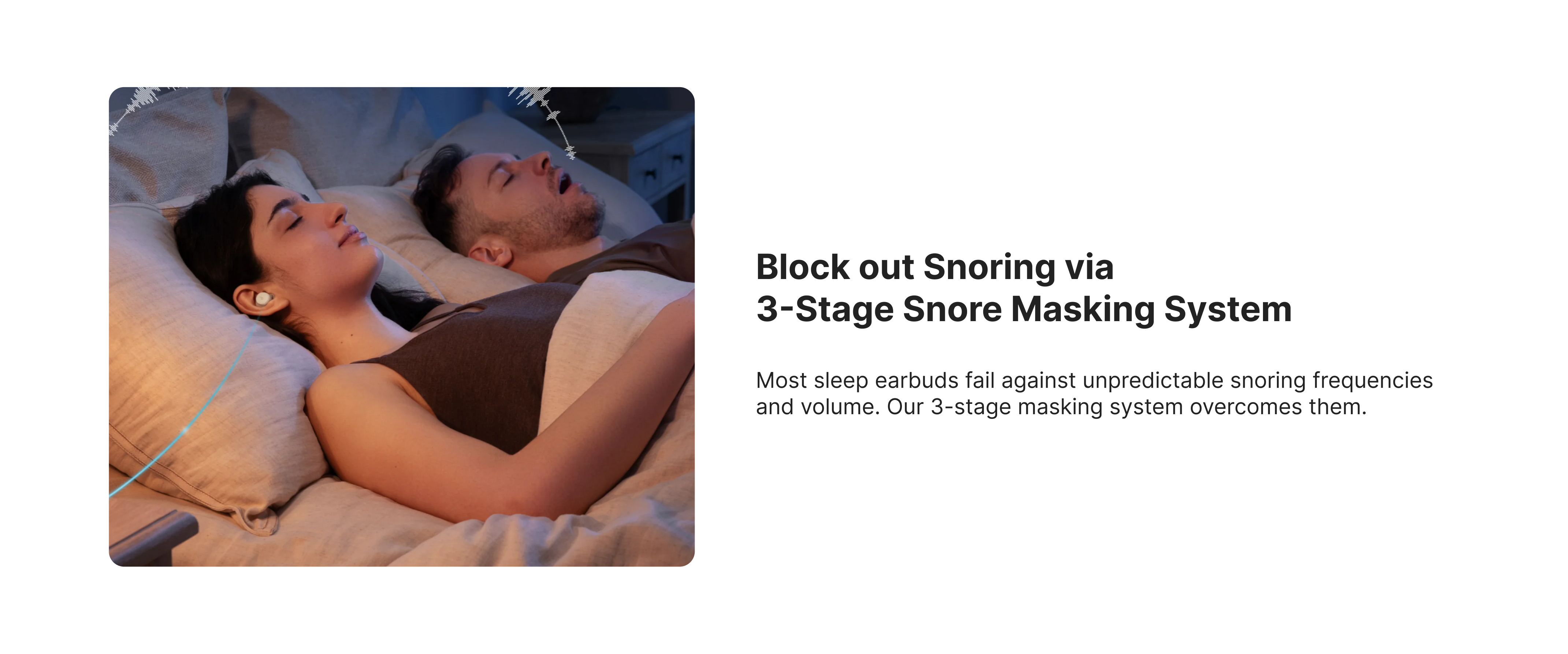 Snore Masking technology works together with the charging case, which monitors snoring sounds and optimizes masking audio in real time. To help your mind wind down, AI Brainwave Audio delivers soothing binaural beats that guide your brain toward relaxation and restorative sleep.
