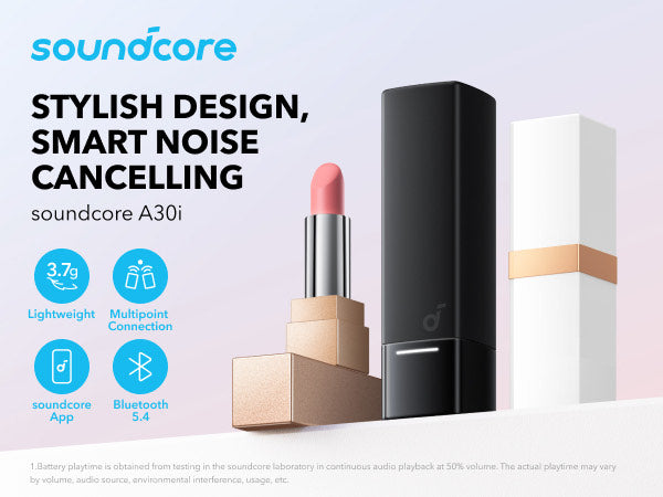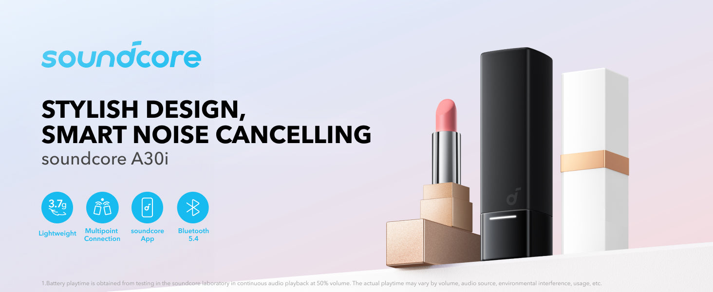 On-the-Go Design: Featuring a chic lipstick-shaped case that’s all about making a statement, Soundcore A30i makes style and comfort a priority. Tiny, lightweight earbuds are ergonomically designed for an optimal fit, while feeling virtually weightless.