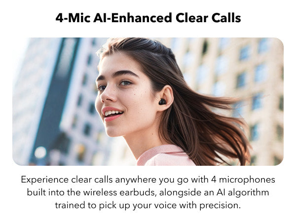 AI-Enhanced Clear Calls: Experience clear calls anywhere you go with 4 mics built into the wireless earbuds, alongside an AI algorithm trained to pick up your voice with precision.