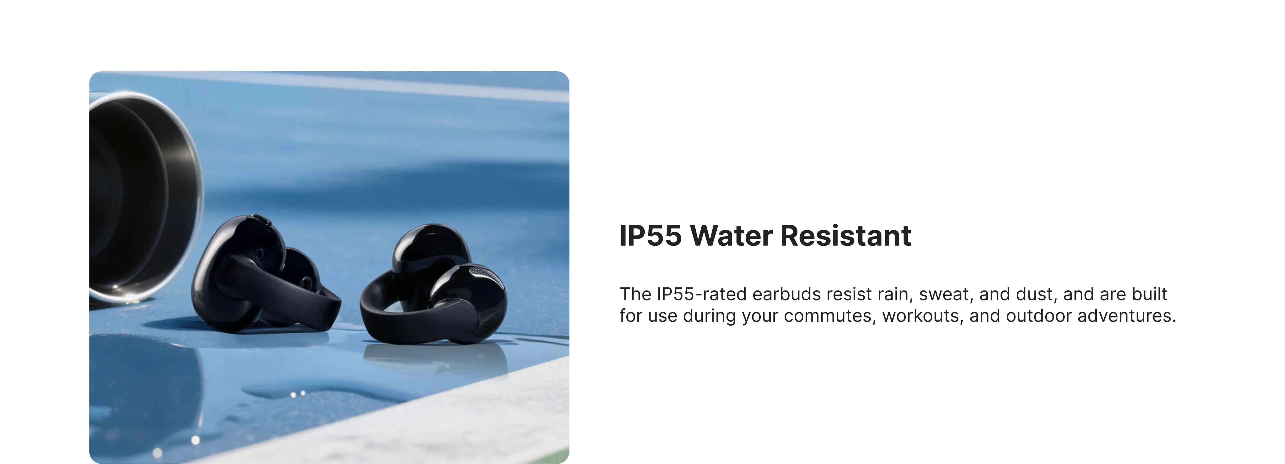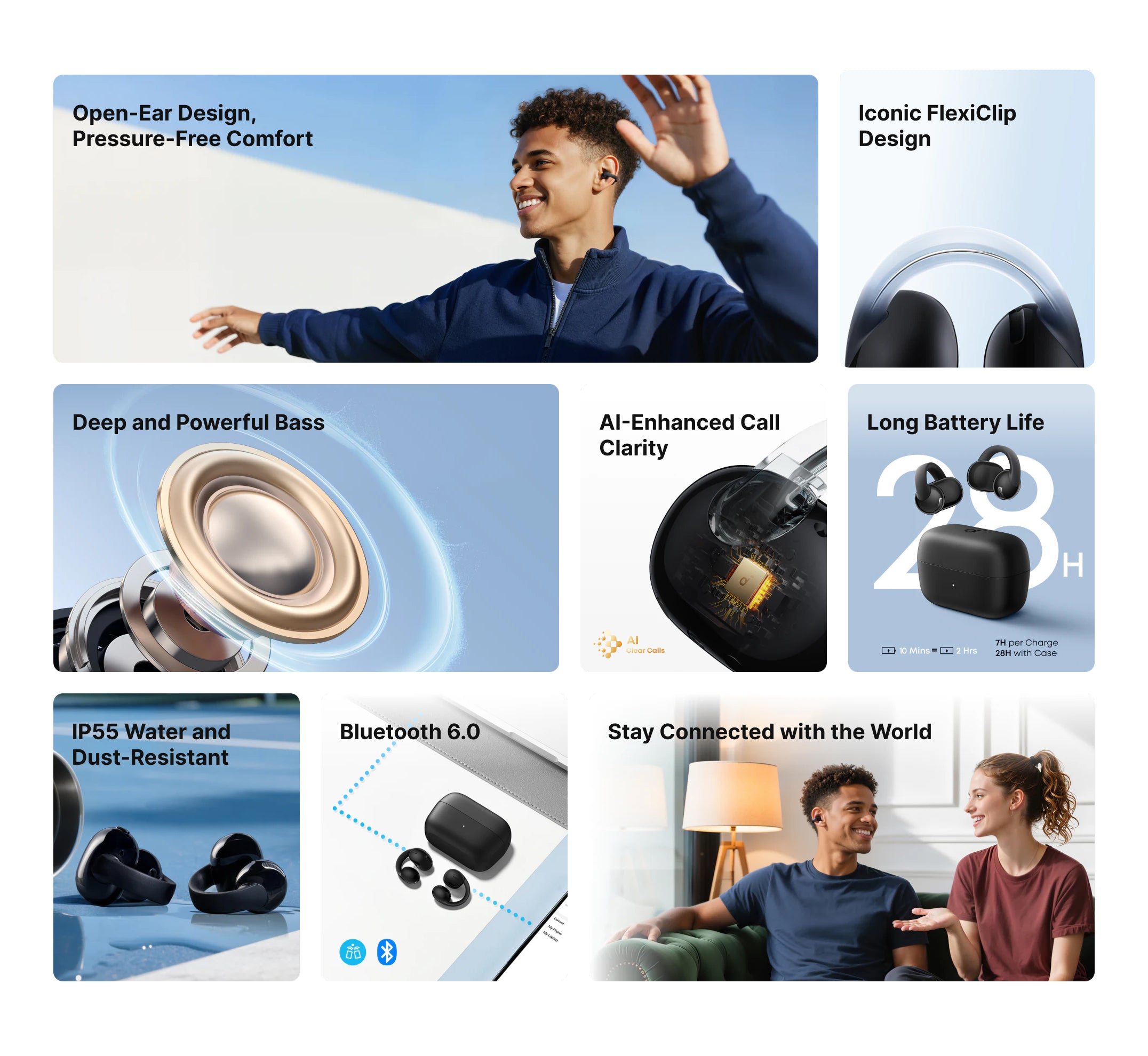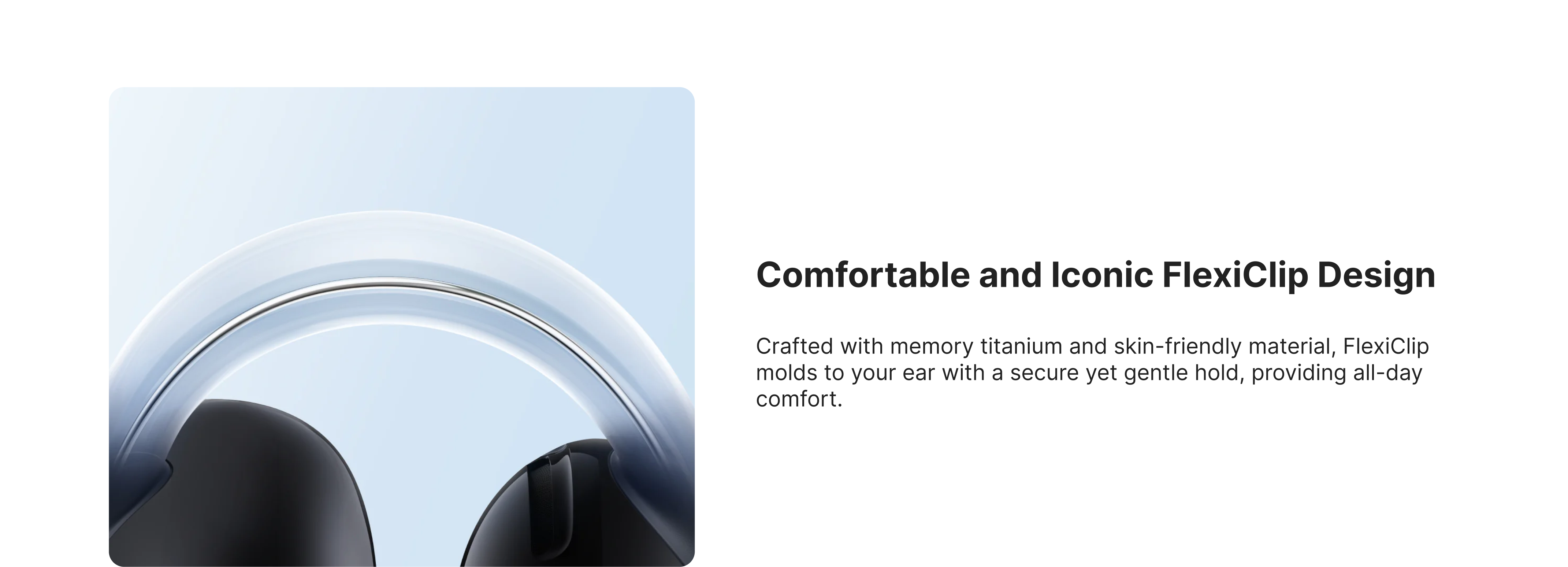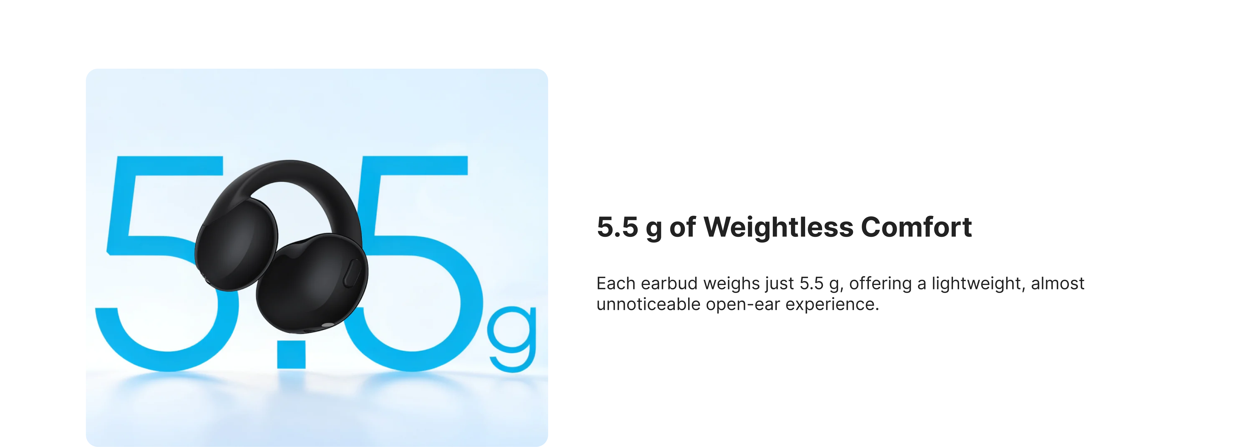 The Soundcore C50i is engineered for listeners who want all-day comfort without sacrificing sound. Its open-ear design keeps your ears pressure-free and naturally aware of your surroundings, making it ideal for commuting, office work, fitness, and daily multitasking. The ultra-light 5.5g frame and adaptive FlexiClip C-bridge ensure a stable, barely-there feel that suits any ear shape.