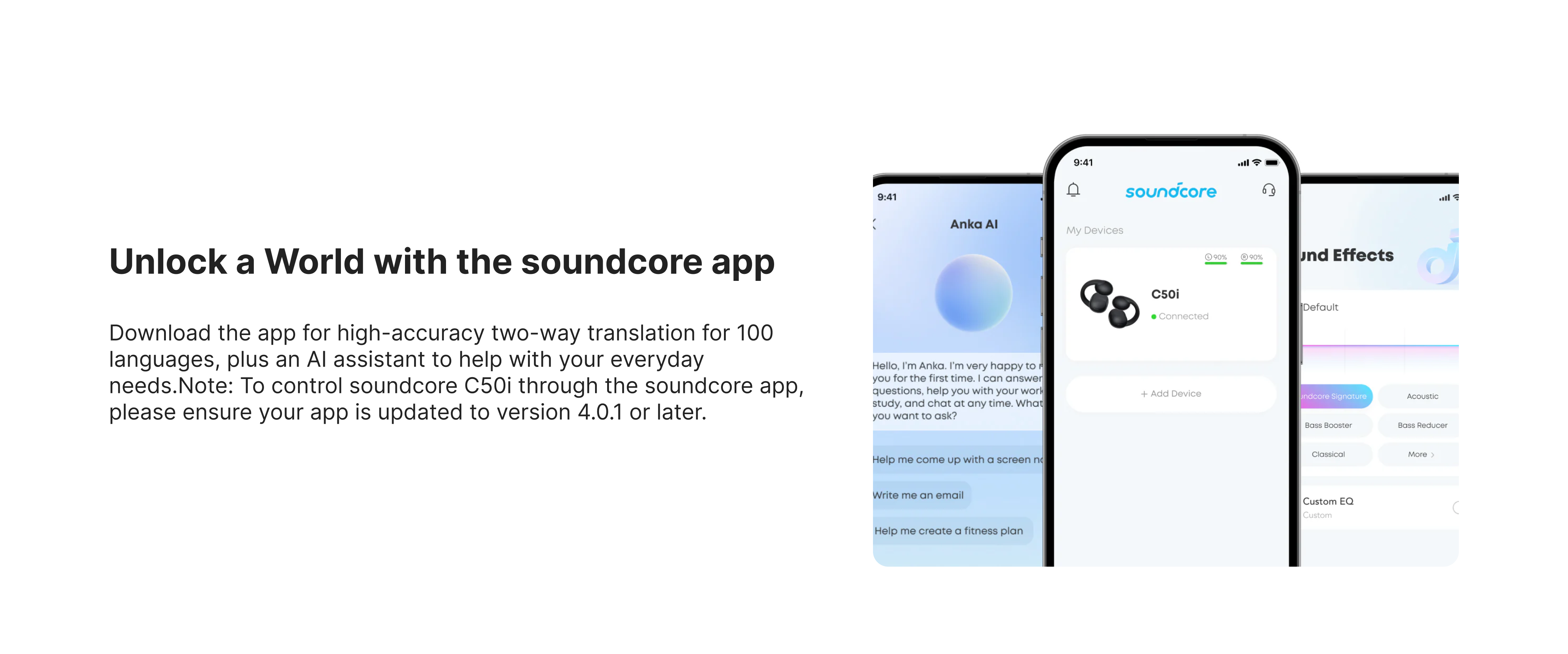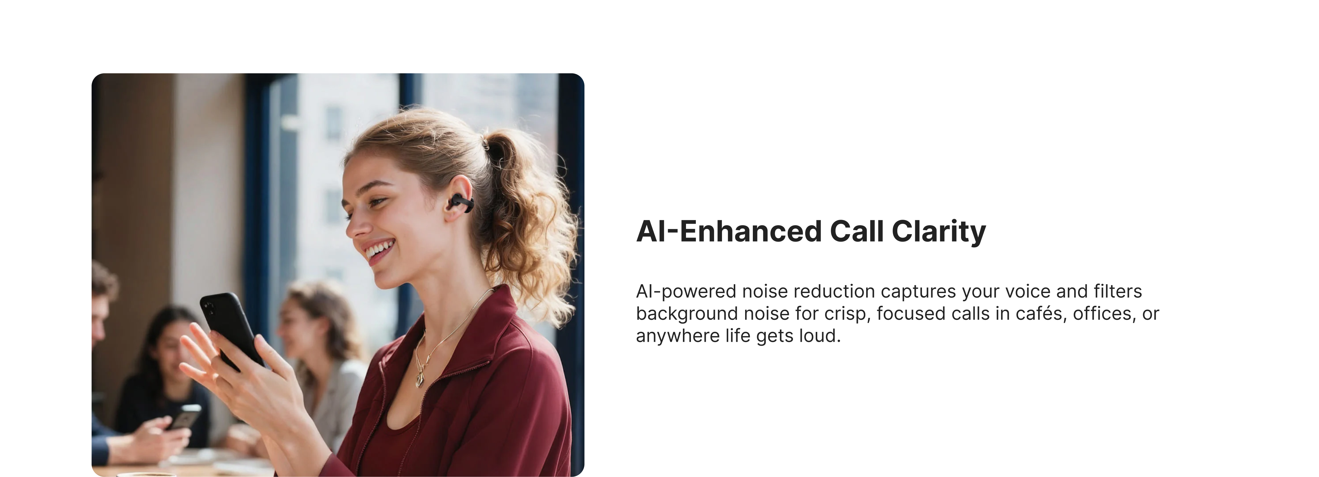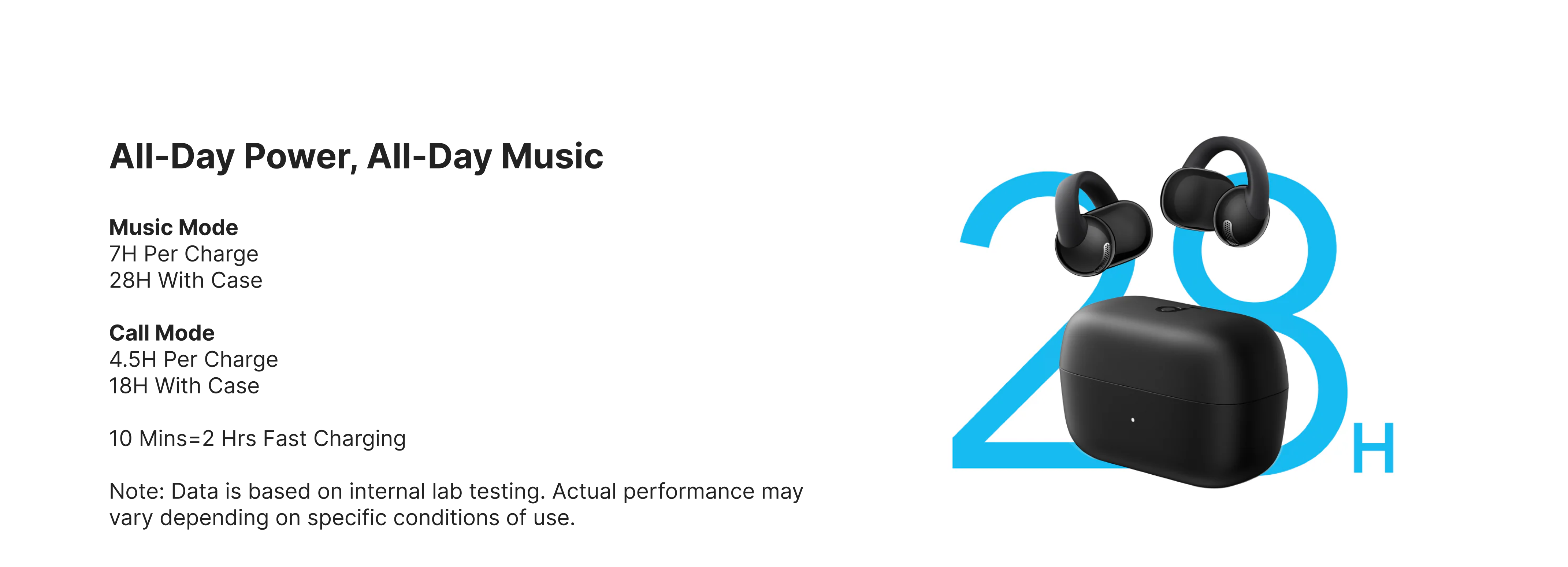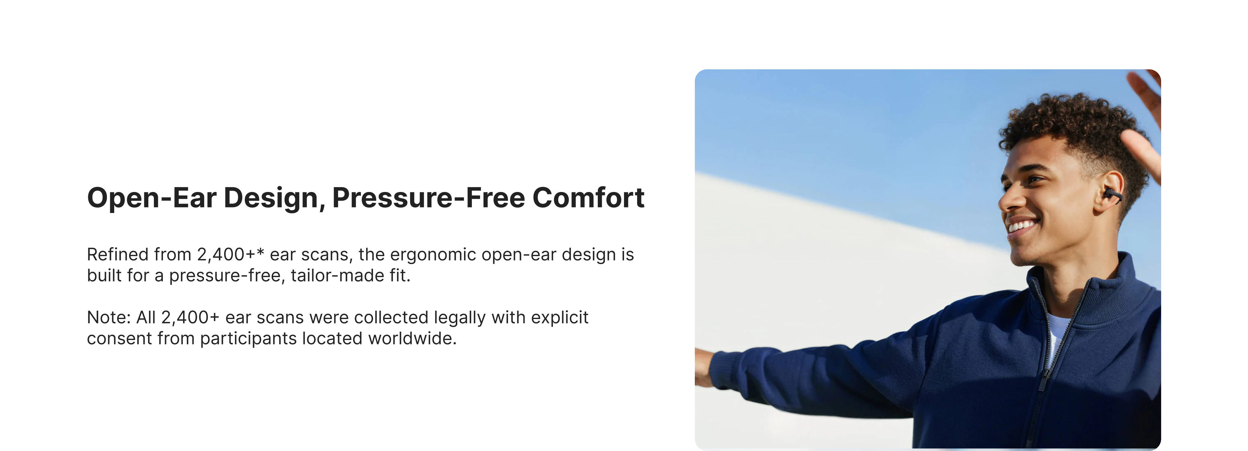 The Soundcore C50i is engineered for listeners who want all-day comfort without sacrificing sound. Its open-ear design keeps your ears pressure-free and naturally aware of your surroundings, making it ideal for commuting, office work, fitness, and daily multitasking. The ultra-light 5.5g frame and adaptive FlexiClip C-bridge ensure a stable, barely-there feel that suits any ear shape.