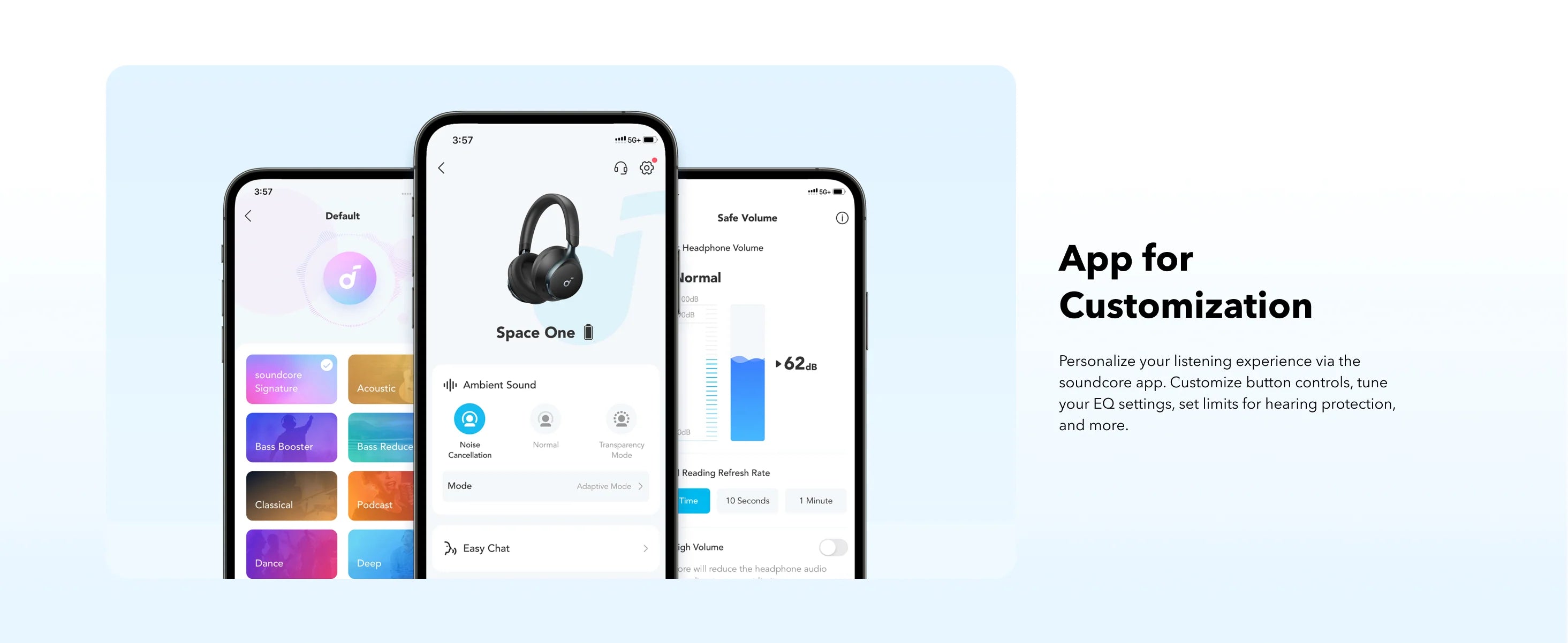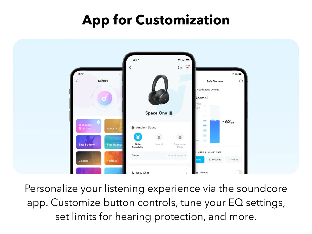1. Space One automatically sets the default ANC and Transparency levels are both set to 5. These levels can be adjusted through the soundcore app according to personal preference.