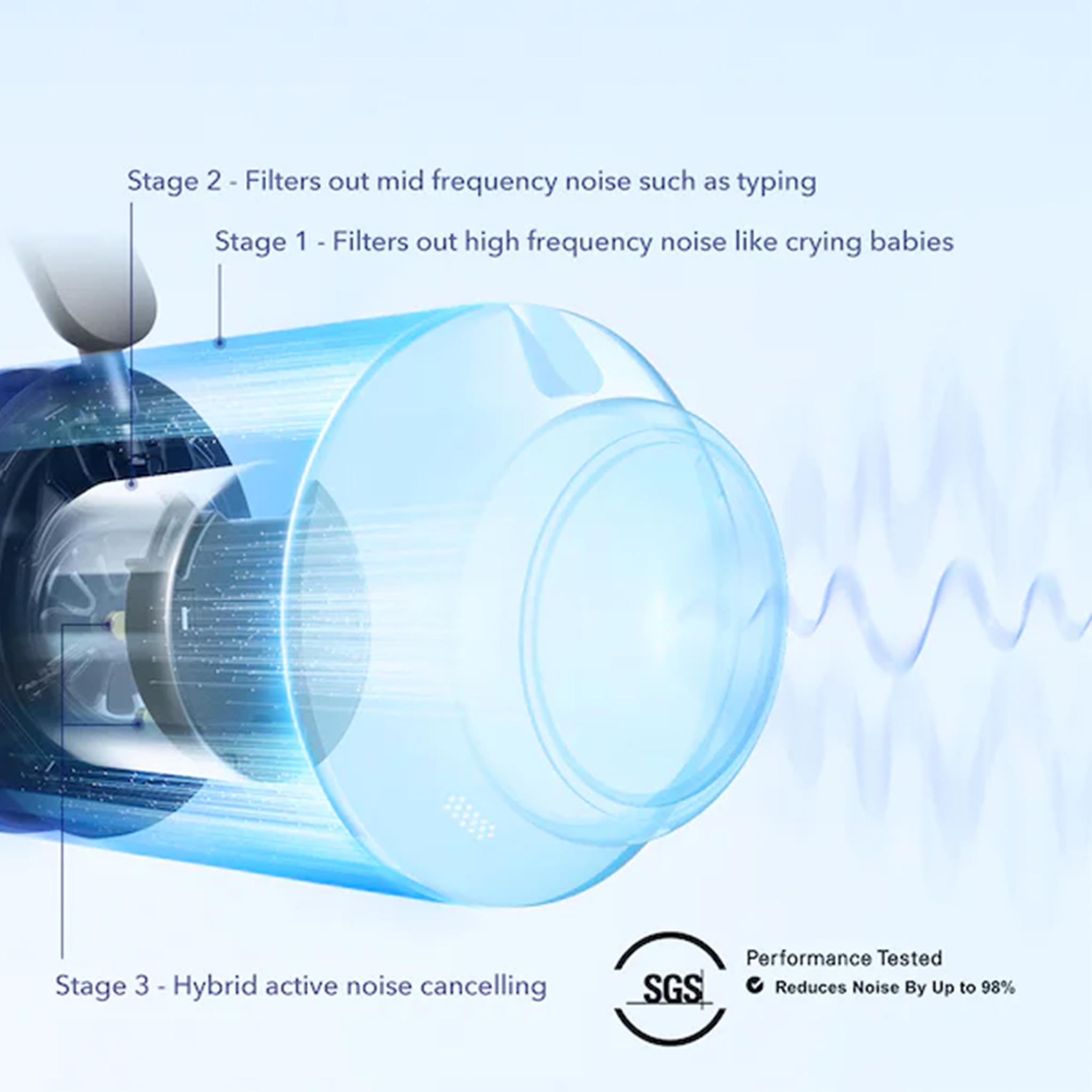 The ultra-wide, 3-stage noise cancelling system targets and blocks out noises precisely.